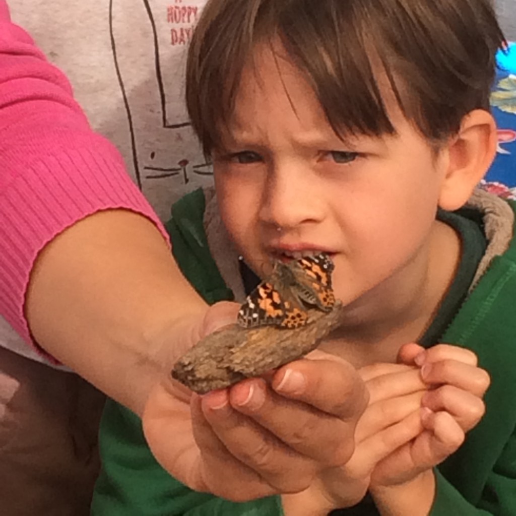 This morning, we let the butterflies go! Once we brought the aquarium outside, all five of them spread their wings and put on a show which the children enjoyed watching. After letting them acclimate to the air for a few minutes, Khuloud removed the top but they didn’t fly right out. They seemed to want to hang out and get a few more sips of orange juice and sugar water. When they left, one-by-one, two of them flew north, two flew east and one hung out on the playground and needed some coaxing to get over the fence.