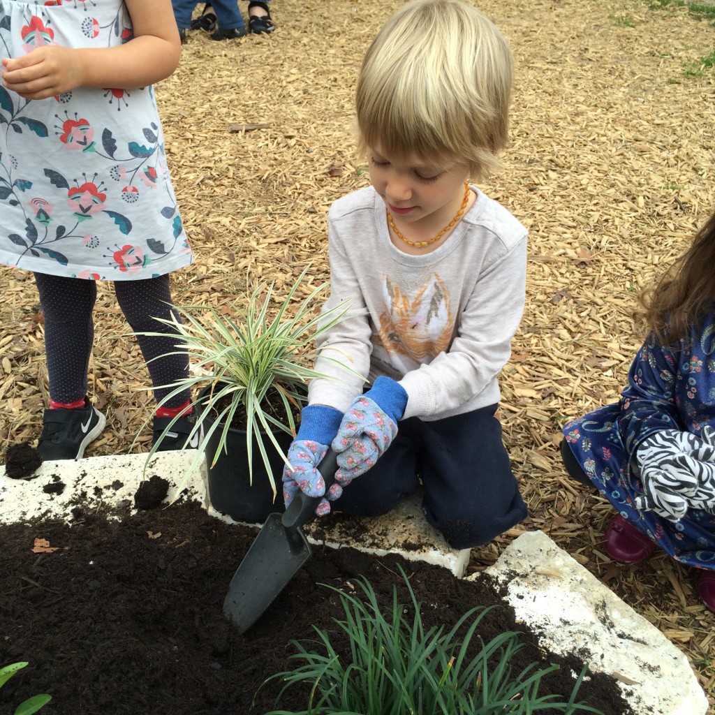 With the awesome help of two of our parents, we now have a lovely new garden in the playground, surrounding our spritely young oak tree. In the spirit of the idea that you will take care of what you create, the students planted all of the new plants!