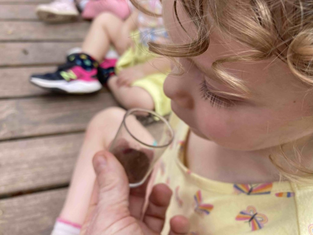 This year, we had a special lesson on the sense of smell. In particular, gingerbread cookies. First, we learned about the cookies and houses by reading several new books. Then, we got out a tray of spices. We smelled cinnamon, ginger, nutmeg and cloves. Lastly, with the help of one of our parents and her oven, we were able to bake gingerbread cookies!