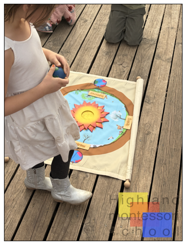 Last month we completed a 4-year-old’s Birthday Circle, and the week prior that of a 5-year-old. Birthdays are a special occasion for a young child, when they are the center of attention. As a part of our Birthday celebrations, the child’s parents bring in photos from each year of their life. We explain to the class how the earth used to go around the sun without them, until Mom and Dad had this baby, at which point they show us a baby picture. The child then “walks around the sun” (carrying a model of the Earth, see photo) while we receive the seasons as they walk. This represents a year of their life, at which point we look at a picture from when they were one year old. We repeat this for each year up to present–effectively, a walking timeline of their life, with pictures.